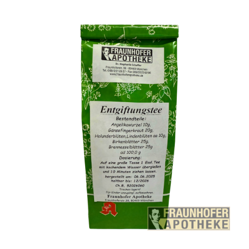 Angelikawurzel 10g, Gänsefingerkraut 20g, Holunderblüten, Lindenblüten aa 10g, Birkenblätter 25g, Brennesselblätter 25g