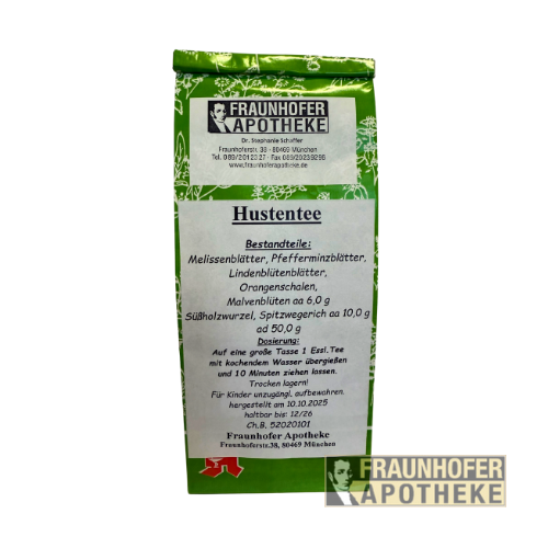 Melissenblätter, Pfefferminzblätter, Lindenblütenblätter, Pomeranzenblüten, Malvenblüten aa 6,0 g, Süßholzwurzel, Spitzwegerich aa 10,0 g ad 50,0 g